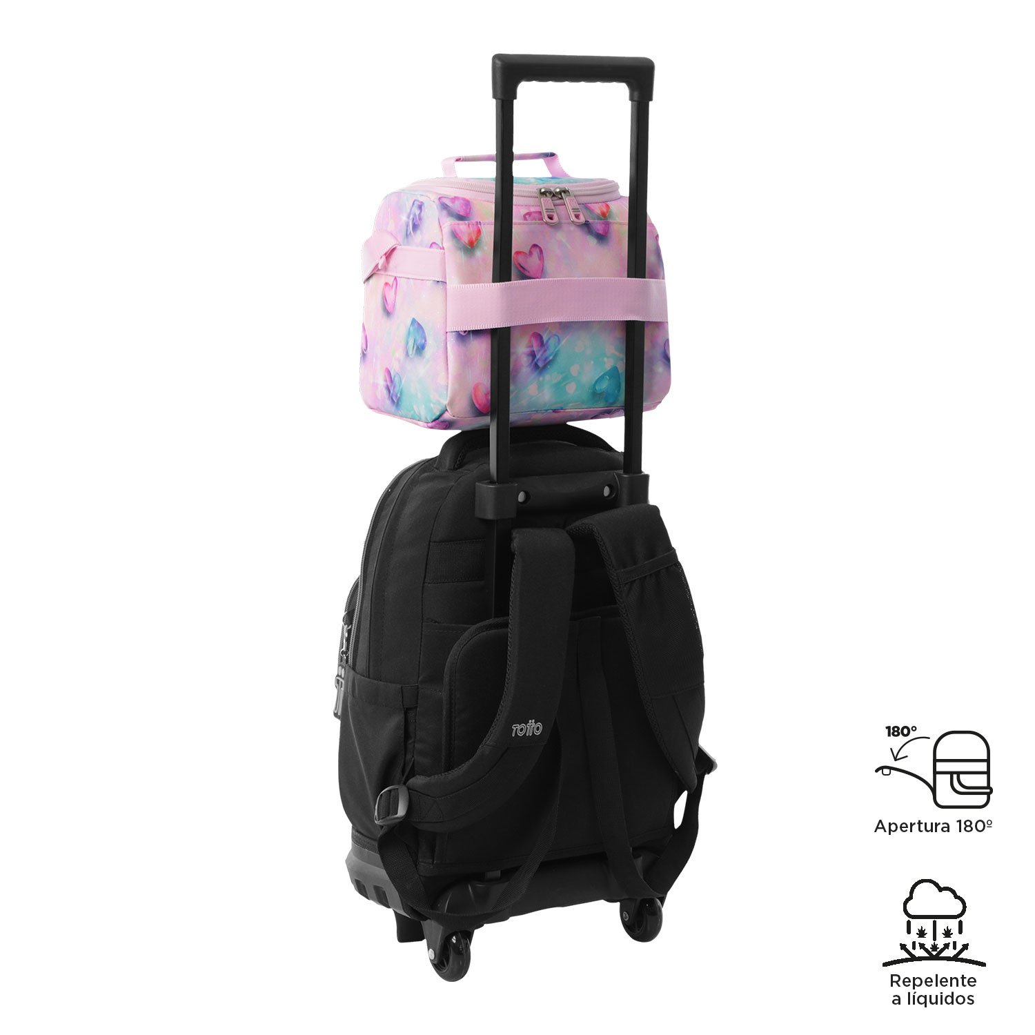 Keep your food fresh and organized! This large lunch bag features a 180° opening, zippered mesh pockets, and a liquid-repellent exterior. Made from 3 recycled plastic bottles, it offers thermal insulation for up to 5 hours, depending on weather conditions. Adjustable straps and a trolley sleeve ensure comfortable carrying.