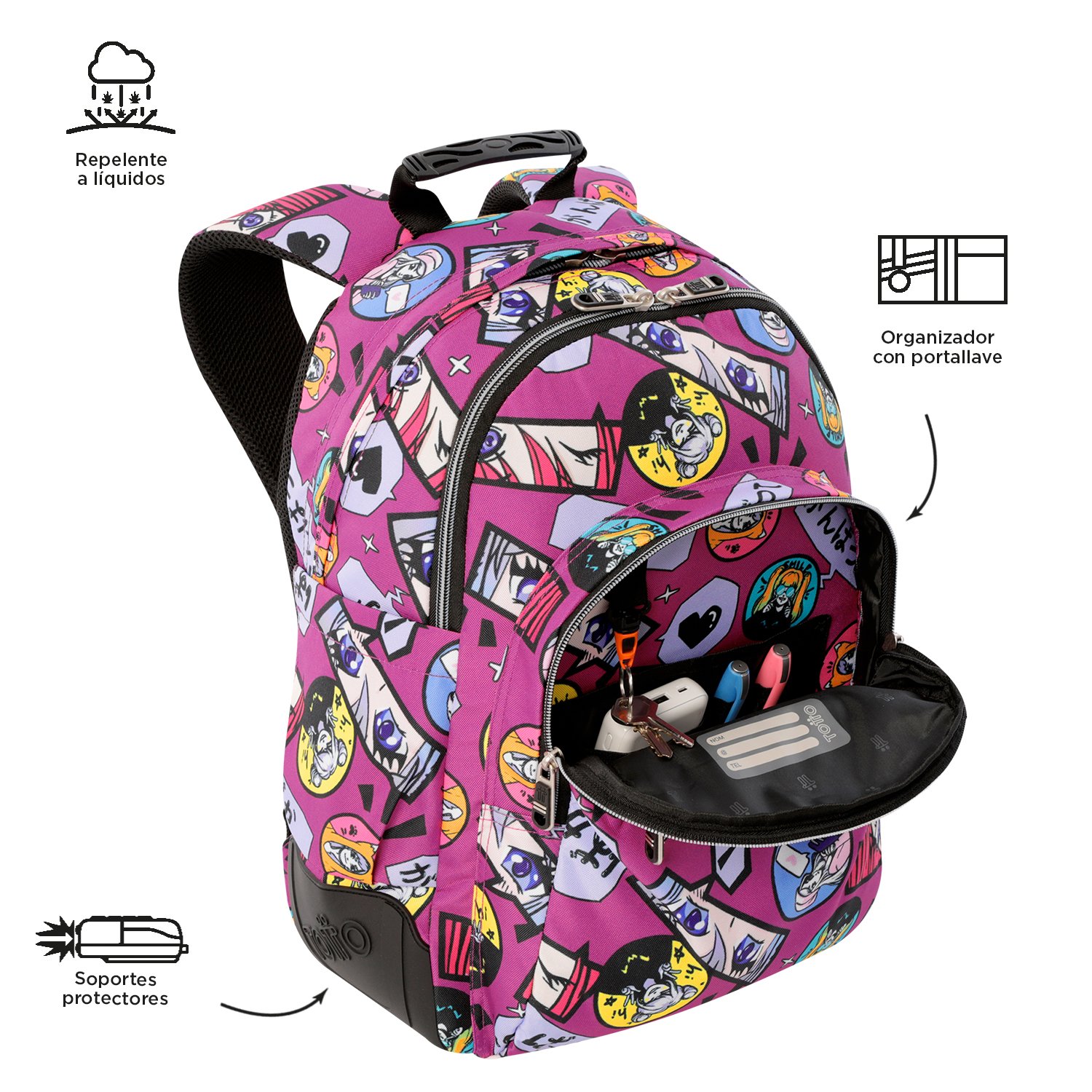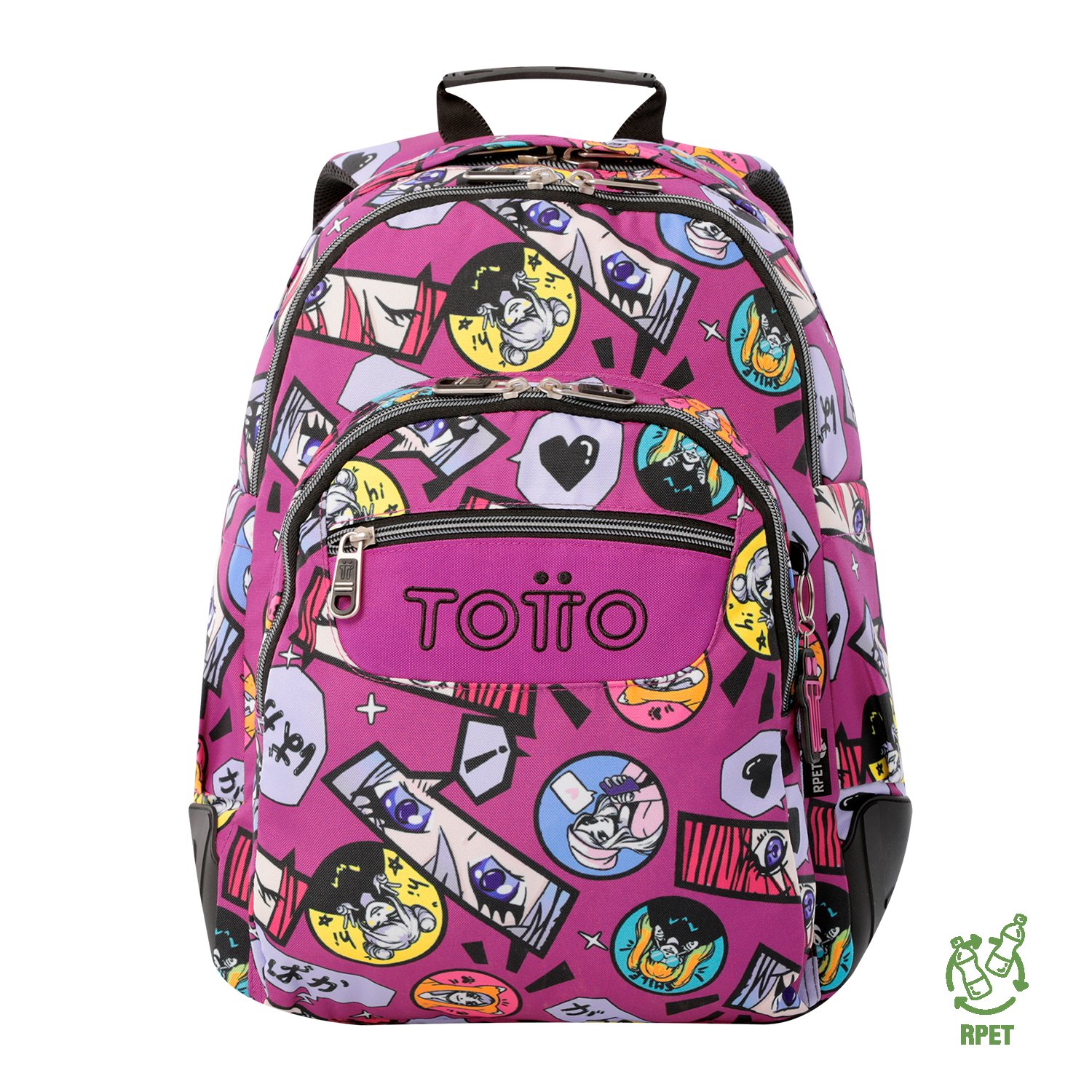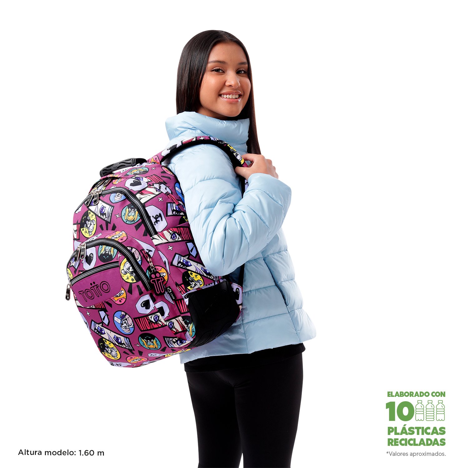 Choose functionality and sustainability! This student backpack features a 14-inch laptop compartment and a 20-liter capacity. Made from RPET canvas using 10 recycled plastic bottles, it includes an internal organizer with key holder, side pockets for a water bottle and umbrella, PVC protective base supports, and quick-access front pockets. Ergonomic shoulder straps with Air Mesh provide maximum comfort.