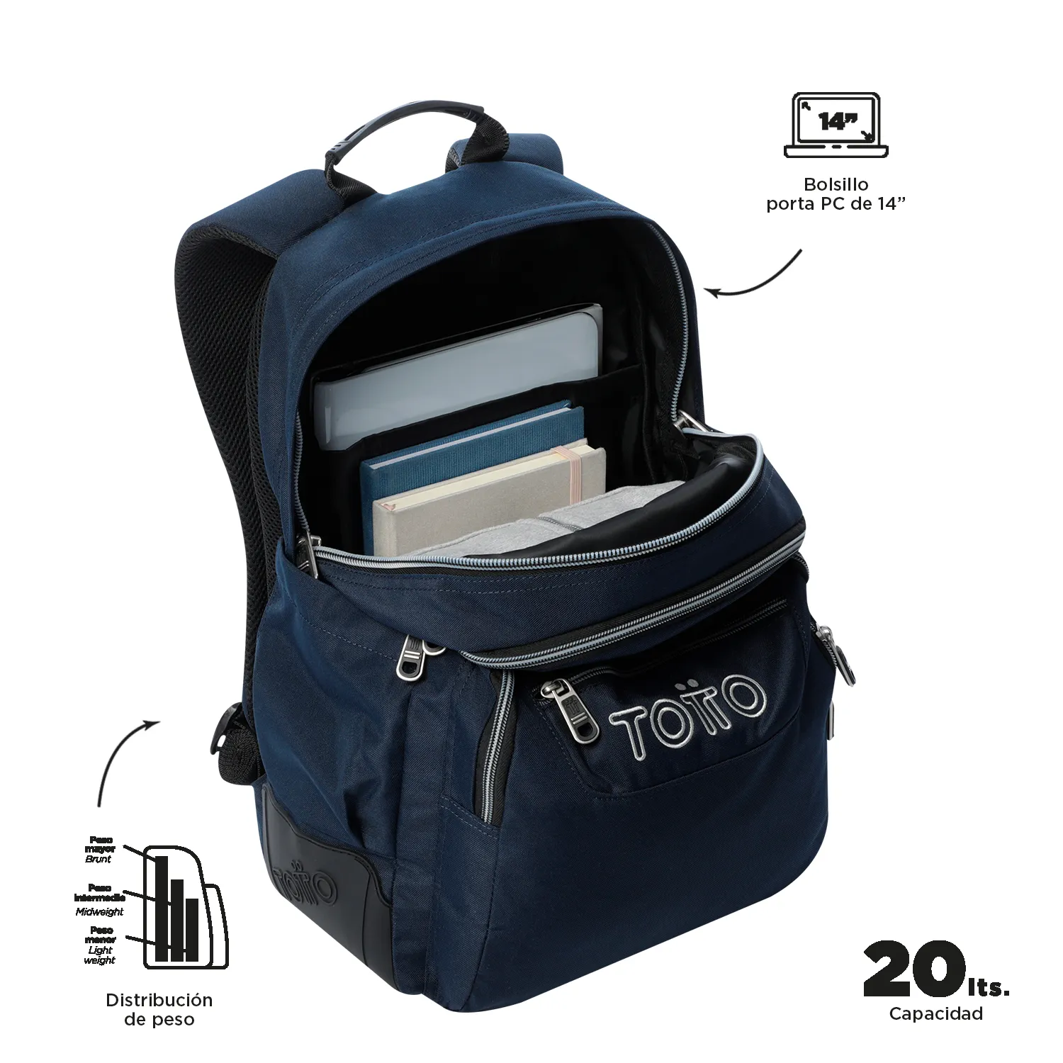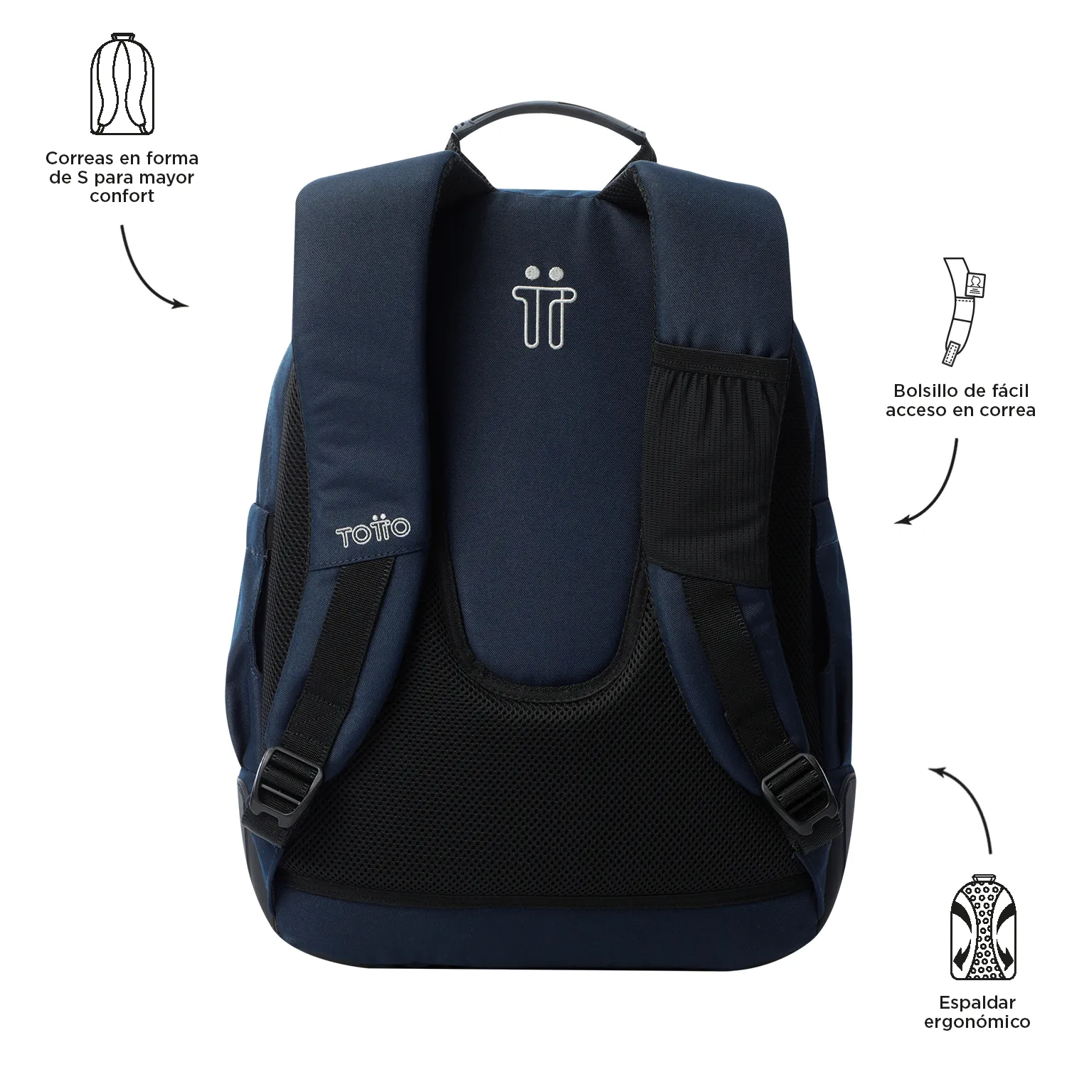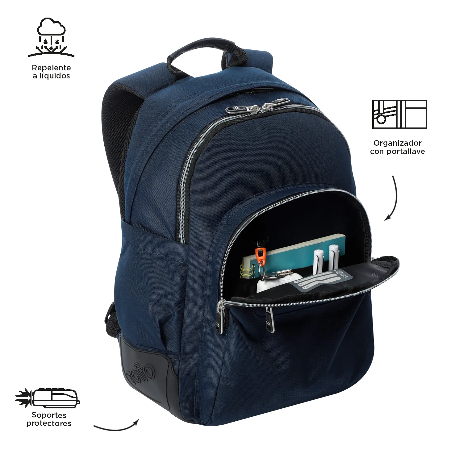 Choose functionality and sustainability! This student backpack features a 14-inch laptop compartment and a 20-liter capacity. Made from RPET canvas using 10 recycled plastic bottles, it includes an internal organizer with key holder, side pockets for a water bottle and umbrella, PVC protective base supports, and quick-access front pockets. Ergonomic shoulder straps with Air Mesh provide maximum comfort.