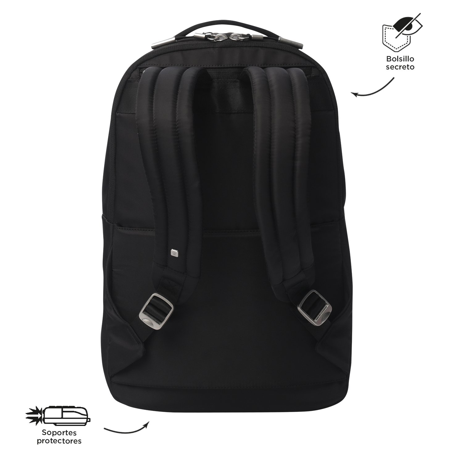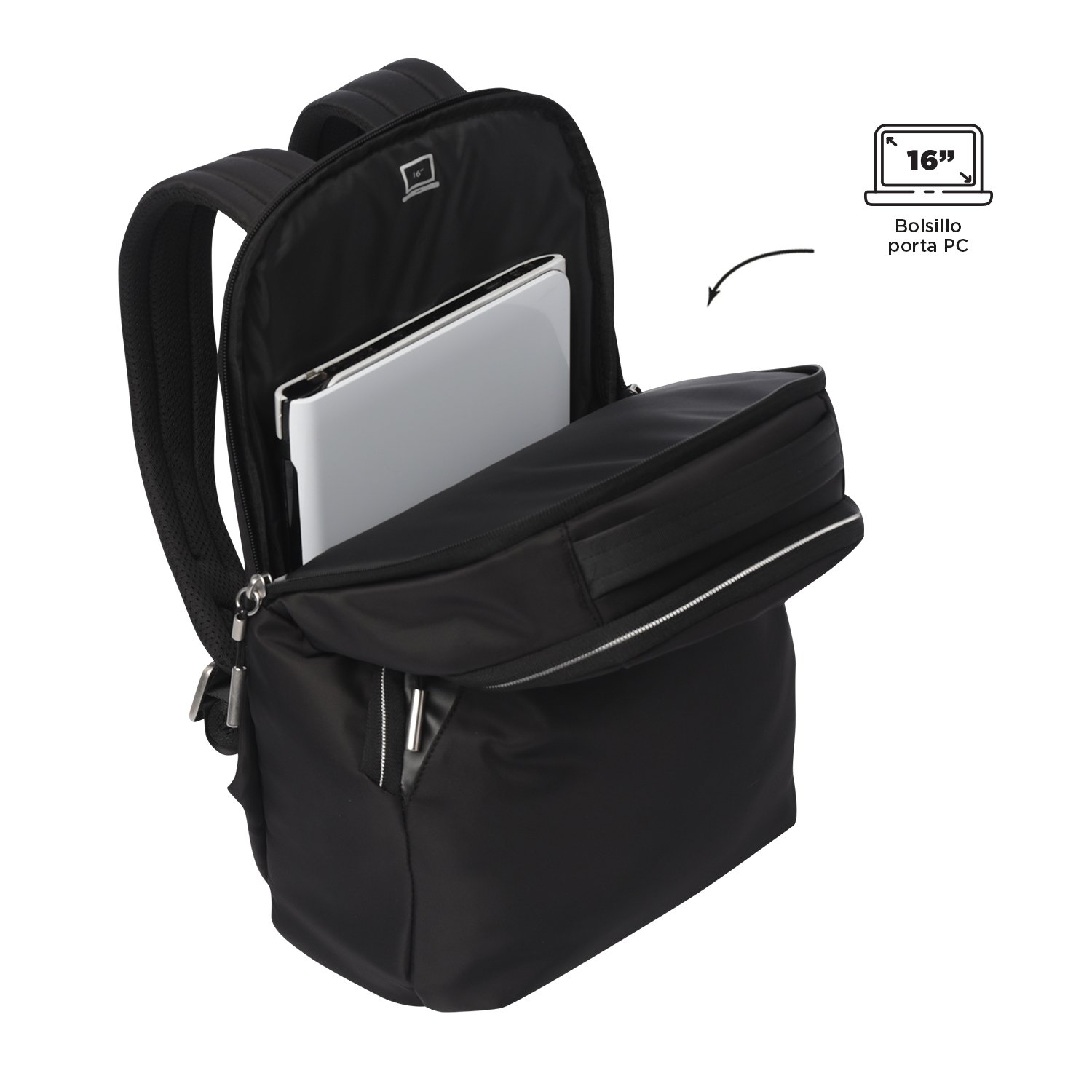 The Roxanne backpack combines functionality and style — perfect for professional women. This medium-sized model features a padded compartment for a 16″ laptop, an internal bottle holder, and a simple zip organizer. Made from high-quality materials, it has a soft-touch finish, refined metallic details, a trolley sleeve, protective metal feet, and padded straps for added comfort. Carry everything you need with ease and elegance!